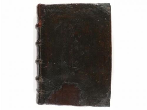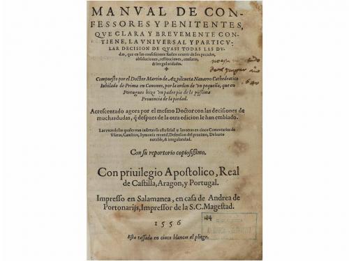 1556. LIBRO. (RELIGIÓN). AZPILCUETA NAVARRO, MARTIN DE:. MANUAL DE CONFESSORES Y PENITENTES, QUE CLARA Y BREVEMENTE CONTIENE LA UNIVERSAL PARTICULAR DECISION DE QUASI TODAS LAS DUDAS QUE EN LAS CONFESSIONES SUELEN OCURRIR DE LOS PECADOS, ABSOLUCIONES, RESTI. Salamanca: en casa de Andrea de Portonariis, Imp. de su magestad, 1556 [en colofón: al fin de la primera obra con fecha: "diez de lulio" y al fin de la segunda obra en "doze de agosto"]. 8º mayor. 8 h. + 799 p. + 169 p. + 33 h. (error de paginación p. 797). Portada con anotaciones manuscritas de época y sello húmedo. Hoja manuscrita de época antes del "Reportorio". Ilustr. con bellas capitales xilográficas. Texto con apostillas marginales y anotaciones manuscritas de época. Las primeras y últimas hojas h. con el margen o punta superior laminadas, últimas hojas con fina galería y tenue cerco de humedad, sin afectar texto; antigua manchita de tinta marginal, alguna hoja tostada. Bella enc. en plena piel de época expertamente restaurada, ambos planos con hierros secos, ruedas, nervios. Palau 21289; CCPB 507-X.