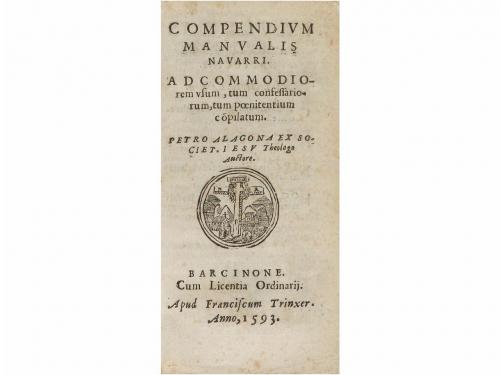 1593. LIBRO. (RELIGIÓN). ALAGONA, PETRO [AZPILCUETA, MARTIN]:. COMPENDIUM MANUALIS NAVARRI. AD COMMODIOREM usum, tum confessariorum, tum poenitentium copilatum. Barcinone: Apud Franciscum Trinxer, 1593 [en Colofón ExTypographia Petri Mali.]. 12º. 3 h. + 456 p. + 25 h. Marca tipográfica en portada. Capital xilografiada. Algún punto de óxido. Antigua anotación manuscrita. Enc. en pleno pergamino rígido de época, lomera y cierres reconstruidos en badana. CCPB 232079-7. Palau 21340 menciona dos portadas en Barcelona, 1593: la de Alexandrum Banus y de Hieronymus Genoves, pero no esta.