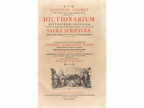1759. LIBRO. (BIBLIA-DICCIONARIO). CALMET, AGUSTIN:. DICTIONARIUM HISTORICUM, CRITICUM, CHRONOLOGICUM, GEOGRAPHICUM ET LITERALE SACRAE SCRIPTURE. Augsburgo: Augustae Vindelicorum, 1759. 2 vol. en folio mayor. I: (Tomus primus A-L). Retrato calcográfico por Mauber a modo de frontis + XVIII + 1 h. + CXLIV + 616 p. Incluye 5 mapas plegados de Tierra Santa y 7 lám. calcográficas firmadas por Iohan. Gottfr. Kolb. Mínimas faltas en el margen exterior de las primeras p. y tenue cerco de humedad en el mismo margen, no afecta texto. II: (Tomus secundus M-Z). 679 p. Incluye 3 mapas plegados y 15 lám. calcográficas firmadas por Ehman y Kolb. Primeras p. con la punta superior restaurada, algunas h. com pequeñas faltas y galería en el margen interior de unas pocas p., en ningún caso afecta texto. Cada vol. con portada propia con viñeta calcográfica, la del primer vol. a dos tintas. Cabeceras, capitales y culs-de-lampe xilografiadas. Texto a dos columnas. La caja del texto alogo tostada. Dos vol. enc. en pleno pergamino moderno, canto del plano anterior rozado. CCPB000072398-3. CCPB000072397-5.
