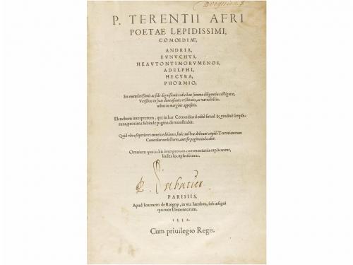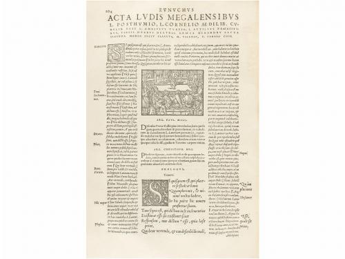 1552. LIBRO. (LITERATURA CLÁSICA). TERENTIUS, AFRI PUBLIUS:. P. TERENTII AFRI POETAE LEPIDISSIMI, COMOEDIAE, ANDRIA, EUNUCHUS, HEAVTONTIMORUMENTOS, ADELPHI, HECYRA, PHORMIO... Parisiis: Apud Ioannem de Roigny, 1552 (en portada y colofón). Folio. 1 h. + 776 p. + 19 h. Bellamente ilustr. con capitales y viñetas xilografiadas. Texto original glosado, enmarcado por los comentarios a dos columnas, apostillas marginales. Cerco de humedad en el margen interior, que no afecta texto menos en las 9 últimas h. Enc. en piel rozada. Presentamos esta curiosa edición de las comedias de Terencio con los comentarios de 16 humanistas como Erasmo, Philippe Melanchoton, etc. Anotaciones manuscritas de anterior poseedor.