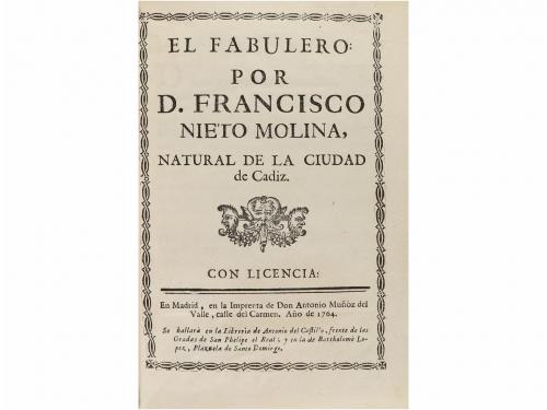 1764. LIBRO. (LITERATURA). NIETO MOLINA, FRANCISCO:. EL FABULERO POR..., NATURAL DE LA CIUDAD DE CADIZ. Madrid: Imp. Don Antonio Muñoz del Valle, 1764. 8º mayor. 5 p. + 124 p. Portada con marca tipográfica y enmarcada con una cenefa xilográfica. Bellamente ilustr. con culs-de-lampe xilografiadas. Ejemplar limpio, márgenes amplios. Contiene de ocho fabulas romances, Polifemo; Alfeo y Aretusa; Apolo y Dafne... En los que homenajea e imita algunas de las mejores historias gentílicas escritas por Góngora, Pantaleón de Ribera, Polo de Medina, Cáncer y Velasco y Trejo y Varona. Enc. en pleno pergamino de época, restos de rotulación en la lomera.