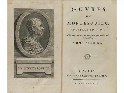 1788. LIBRO. (LITERATURA FRANCESA). MONTESQUIEU:. OEUVRES DE ... Paris: Chez Jean-François Bastien, 1788. 5 vol. en 8º mayor. I: Frontis + 4 h. + CXI + 2 mapas plegados + 438 p. II: 2 h. + XVI + 574 p. III: VIII + 509 p. IV: 2 h. + 495 p. V: VI + 531 p. Retrato calcográfico por Gerardin, incluye los dos mapas grabados: "Supplement pour la carte du livre..." y "Carte pour l'intelligence du... l'Esprit des Loix...", ambos con ligeras señales de óxido y una pequeña rasgadura. Mínimas y esporádicas señales de óxido. 5 vol. enc. en pasta española, marcos dorados en ambos planos, lomera cuajada, nervios, doble tejuelo, cortes jaspeados, ligeramente rozada y mínima pérdida de piel en el extremo superior de la lomera. Completa edición de las obras de Montesquieu y máximo exponente de la personalidad de la Ilustración francesa.
