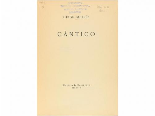 1928. LIBRO. (LITERATURA). GUILLÉN, JORGE:. CÁNTICO. Madrid: Revista de Occidente [tipografía Nacional], 1928. 8º mayor. 171 p. Cubiertas originales. Sello de antigua biblioteca. Magnífico ejemplar, con ligera marca de antigua etiqueta en el lomo. PRIMERA EDICIÓN. "Cántico" se presentó (1928) como el paradigma de la poesía pura. "Bastante pura, ma no troppo" matizó Guillén en su carta a Fernando Vela. Cántico constituye el desarrollo de una intuición de la realidad, que glosa su subtítulo, agregado en 1945: Fe de Vida. Tal intuición debe juzgarse históricamente sobre el fondo del pesimismo modernista y se inscribe dentro del "optimismo conceptual", que entre 1917 y 1920 recorre ciertas vanguardias europeas, desde el cubismo al futurismo (Oreste Macri). La obra poética de J. Guillén constituye una de las empresas mayores de la lírica europea de este siglo (XX) por la novedad de la visión y la singularidad del estilo. Cántico es su culminación.