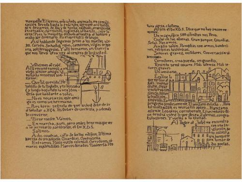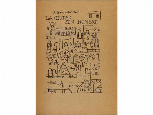 1941. LIBRO. (LITERATURA-VANGUARDIAS). TORRES-GARCIA:. LA CIUDAD SIN NOMBRE. Montevideo: Asociación de Arte Constructivo, 1941. 8º menor. Sin paginar. 53 h. Profus. ilustr. en texto. Bella enc. de TEJERINA en plena piel con marcos dorados en ambos planos, lomera con nervios, cejas y corte superior pintado. Segundo libro caligráfico que el autor editó en vida. Conserva las cubiertas originales; levísima restauración en el verso de la cubierta anterior, aun así buen ejemplar. PRIMERA EDICIÓN.