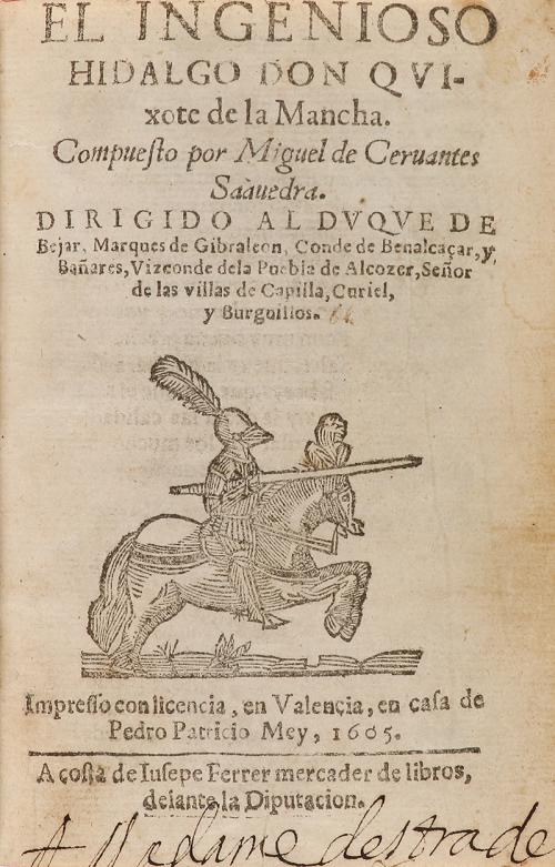 1605. LIBRO. (CERVANTINA). EL INGENIOSO HIDALGO DON QUIXOTE DE LA MANCHA. Valencia: en casa de Patricio Mey, 1605. 8º menor. 16 h. + 768 p. En la portada grabado xilográfico de un caballero con lanza en ristre. Última hoja facsímil, corto de margen superior. Algún leve cerco de humedad y punto de óxido, en general muy buen ejemplar. Enc. en plena piel con hilos dorados enmarcando ruedas secas, cantos y cejas, nervios, cortes pintados, firmada por V. ARIAS, presentado en petaca de cartoné. Exlibris en el contraplano de Armando Cotarelo Valledor, gran conocedor y estudioso de la obra de Cervantes. Marca manuscrita de antiguo poseedor en la portada. El impresor Pedro Patricio Mey pertenecía a una familia de tipógrafos flamencos que se había afincado en España dos generaciones antes y se había ganado un buen nombre entre los impresores del país por la alta calidad de su trabajo. Esta es la primera tirada de las dos impresiones que Patricio Mey realizó en 1605, por lo tanto es la quinta impresión del texto. Fácilmente distinguible de la segunda tirada por los errores tipográficos, el primero de ellos el reclamo en el recto del texto de la aprobación, que en esta dice Al y en la segunda corrige La, además de numerosos errores de paginación. Ginavel cree que Mey realizó dos ediciones porque la primera no fue muy numerosa, de la Cuesta había hecho ya dos en Madrid, pero la vendió rápido pues también abasteció el mercado de Barcelona, que no recibió permiso para imprimir la obra hasta 1617, de manera que es posible que imprimiera la segunda tirada poco después. Salvá 1546: "no es necesario advertir que las dos ediciones valencianas compiten en rareza con las de Madrid". Suñé 6: "puede afirmarse (...) que son distintas las dos ediciones valencianas y que no se corresponden, ni pueden corresponder, a una misma tirada los ejemplares conocidos entre los bibliófilos por la diferencia que existe en el reclamo de la segunda hoja (...)". Palau 51979.