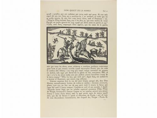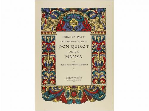 1936. LIBRO. (BIBLIOFILIA). CERVANTES SAAVEDRA, MIGUEL DE:. DON QUIXOT DE LA MANXA. Sant Feliu de Guíxols: Octavi Viader, 1936. 2 vol. en folio menor. I: XIV + 143 f. + 1 h. II: VIII + 190 f. + 1 h. Impreso a dos tintas. Preciosas cromolitografías en la portada, exlibris y letras capitales en las hojas de prólogo. Ilustr. con numerosos grabados en texto. Enc. en pergamino rígido con hierros en el plano anterior y lomo. Corte superior dorado. Edición numerada de 560 ejemplares sobre papel especial plantin.