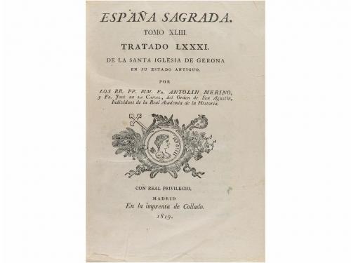 1819. LIBRO. (GIRONA). MERINO, ANTOLIN; CANAL, JOSE DE LA:. ESPAÑA SAGRADA. TOMO XLIII: DE LA SANTA IGLESIA DE GERONA EN SU ESTADO ANTIGUO. Madrid: Imp. de Collado, 1819. 8º mayor. 1h. + XXXV + 541 p. + +1 h. Ilustr. con cabeceras y capitales xilografiadas. Texto a dos columnas. Papel limpio y conserva todas sus barbas. Incluye "Documenta ad antiquum ecclesiae gerundensis statum spectantia" p. 367. Enc. media piel, lemera ligeramente rozada. CCPB 78100-2.