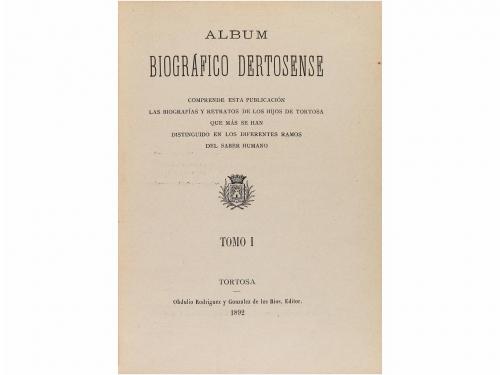 1892. LIBRO. (TARRAGONA-TORTOSA). ALBUM BIOGRAFICO DERTOSENSE. Comprende esta publicación las biografías y retratos de los hijos de Tortosa que más se han distinguido en los diferentes ramos del saber humano. Tortosa: Obdulio Rodríguez y González de los Rios, 1892. 4º menor. 219 p., 3 h. Láminas con retratos de los biografiados. Enc. media piel, planos rozados. A pesar de la indicación de "Tomo I", el presente es el único publicado.