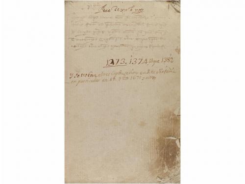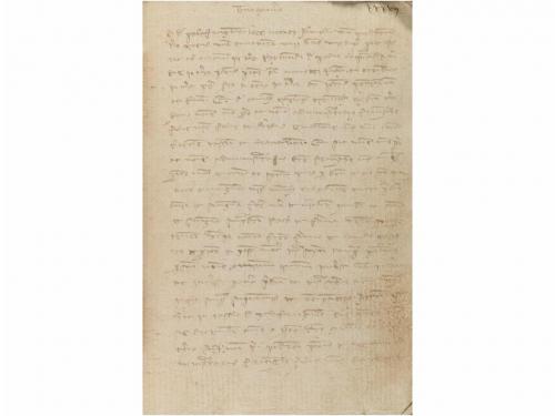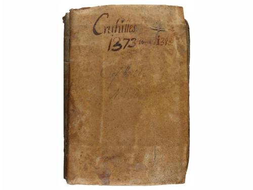 s. XIV. MANUSCRITO. CABREVACIÓN DEL MONASTERIO DE SAN MARTÍ DE CRUÏLLES, EN PALAFRUGELL. Gran volumen manuscrito sobre papel y encuadernado en 4º menor en pergamino de época. Lleva manuscrito en el plano anterior "Cruhilles./ 1373 iusqua 1388". Al principio lleva un pliego de 6 donde se ha relacionado un índice con el contenido del manuscrito. Este índice es posterior, probablemente del s.XVII. Sigue a este pliego todo el documento del s. XIV, comenzando por el índice, algo deteriorado, lo que explica la inclusión del primero. En el inicio del documento aparece el nombre del notario Pere Rexach. Todo manuscrito de la misma mano, folios numerados en romana, manuscrito hasta el CXXXIV y a partir de este, siguen numerados pero en blanco hasta el CLII, manuscrito hasta el final. Últimas páginas han sufrido daño por agua. Manuscrito sobre recio papel de la época y abarca desde el año 1373 a 1388, y recoge las declaraciones de deberes de vasallaje de los habitantes de las propiedades de este monasterio. Parece que el documento solo recoge los vasallos del término de Palafrugell. Es un tipo de documento que suele quedar abierto durante varios años, esperando que todos cumplieran con su señor, en este caso el monasterio de San Martí de Cruïlles. Este cenobio tiene una historia milenaria, a pesar de ello no abunda la documentación sobre él, de manera que este documento viene a llenar un vacío que puede dar mucha información acerca de la riqueza de esta comunidad a finales del s. XIV.