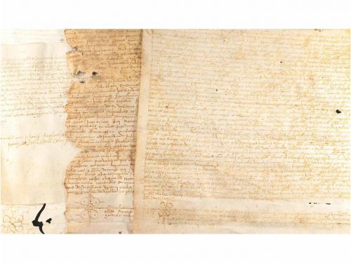 1513, 1519, 1561, 1549. MANUSCRITO. (PERGAMINO). LOTE DE CUATRO DOCUMENTOS SOBRE PERGAMINO FIRMADOS ANTE NOTARIO. El primero firmado por el notario de Sant Esteve de Banyoles el 10 de noviembre de 1513, establecimiento de una enfiteusis. El segundo dado ante el notario de Besalú, Joan Rafel Ell, el 16 de octubre de 1519, es un ápoca de pago. El tercero dado el 11 de mayo de 1531 en Banoles ante Gabriel Ros, y es una donación de 100 ducados en vestidos y joyas de una dote matrimonial. El último documento está fechado en 1549, aunque la tinta está algo desvaída.