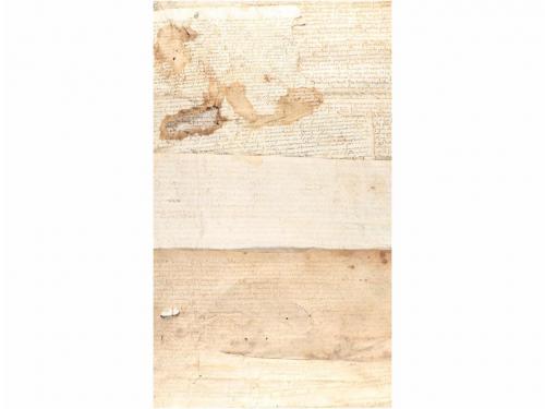 1544, 1556, 1559 y 1568. MANUSCRITO. LOTE DE 4 PERGAMINOS FIRMADOS ANTE NOTARIO EN LA ZONA DE GIRONA. El primero firmado ante el notario de Girona Narcís Gifra, se trata de una donación y fue dado el 2 de enero de 1544. El segundo se firmó en febrero de 1556 y define ante notario las legítimas paterna y materna además de un pago en moneda a Miquel Joan, de la parroquia de Bescanó. El tercer documento está firmado ante el notario de Girona Miquel Renarol y es una venta perpétua del mas Serra, con sus tierras, honores y posesiones. Por último un pergamino fechado en 1568 que detalla las legítimas de Miquela Caselles a favor de Pere Caselles, su hermano, de la parroquia de Vilert.