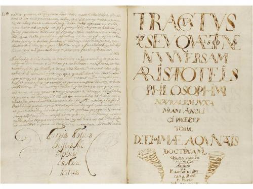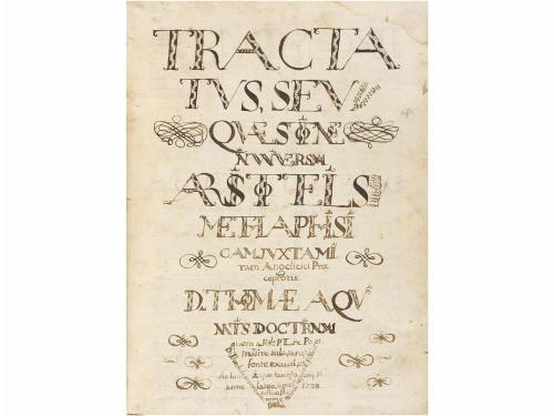 1728. LIBRO. (MANUSCRITO-FILOSOFÍA). ARISTOTELIS:. TRACTATUS SEU QUAESTIONE UNIVERSAM ARISTOTELIS METHAPHISICAM JUSTAMIRAM ANGELICI... Manuscrito enc. en 8º mayor. 108 p. [Sigue:] TRACTATUS SEU QUAESTIONES UNIVERSAM ARISTOTELIS... 1 h. + 238 p. + 4 h. Todo manuscrito de la misma mano en una apretada caligrafía de finales del s. XVIII. Enc. en pergamino, lomera rotulada, en una petaca de tela.