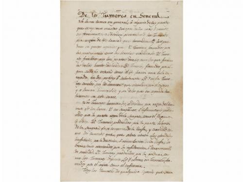 1780 ca. MANUSCRITO. DE LOS TUMORES EN GENERAL... Manuscrito en 8º mayor. Ha perdido la primera h., que probablemente contendría el título de la obra y dos folios entre la p. 274 y 281, punto en el que se produce un cambio de amanuense, aunque a partir de la p. 455 recupera el primero. 528 p. + 4 h. de índices. Enc. en pasta española, algo rozada, cortes pintados, conserva parcialmente el tejuelo. A pesar del título, no solo se ocupa de los tumores, sino también de otras afecciones, enfermedades y lesiones.