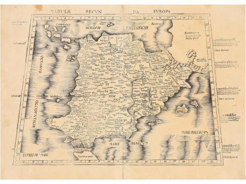 1520 ca. MAPA. (PENÍNSULA IBÉRICA). [WALDSEEMÜLLER, MARIN:]. TABULA SECUNDA EUROPE. Xilografía de proyección cónica. 46 x 64 cm papel. Contiene hidrografía y accidentes geográficos. En la obra "Geographia" del astrónomo y geógrafo egipcio Caludio Ptolomeo, publicada en 1520 en Estrasburgo.