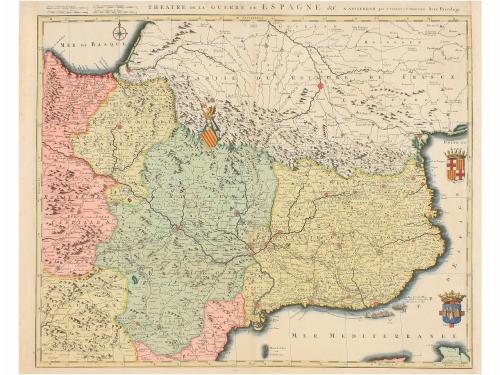 1692 ca. MAPA. COVENS, I. y MORTIER, C.:. THEATRE DE LA GUERRE EN ESPAGNE. Amsterdam. Grabado calcográfico del noreste peninsular que abarca Cataluña, Aragón, Navarra, y parte de las Castillas. Bien coloreado, con los escudos de Cataluña, Aragón y Valencia. Márgenes y pliegue central reforzados.