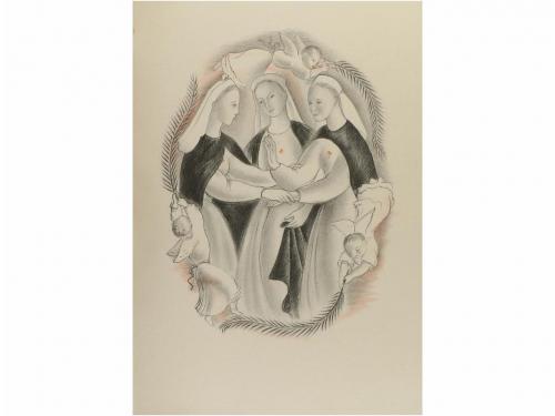 1902. LIBRO. (BIBLIOFILIA). HUGO, VICTOR:. CINQ POEMES: BOOZ ENDORMI - BIVAR O SALDATS DE L'AN DEUX! - APRES LA BATAILLE - LES PAUVRES GENS. Paris: Editions d'Art Edouard Pelletan, 1902. 4º. 71 p., 3 h. Esporádicas manchas de óxido. 35 ilustraciones de Auguste Rodin, Eugène Carrière, Daniel Vierge, Willette, Dunki, Steinlen. Encuadernación firmada por Camavon en media piel y puntas, lomera cuajada, conserva las cubiertas originales. Desperfectos en la encuadernación pero lleva Exlibris de Gustavo Gili de después del bombardeo de Barcelona en 1938, que lo marca como uno de los ejemplares supervivientes de su biblioteca. Edición numerada realizada con motivo del centenario del nacimiento de Victor Hugo.