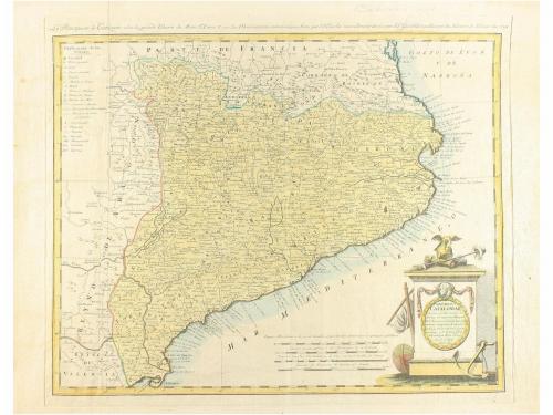 1798. MAPA. (CATALUNYA). GÜSSEFELD, [HOMANN, LOPEZ, CASSINI]:. PRINCIPATUS CATALONIAE IN SUAS SUBDIVISIONES HODIERNAS AD MAGNAM MAPPAM D. I. LOPEZ... Norimbergae Hom. Hoered., mapa grabado y coloreado. 45 x55 cm huella, 51 x 64 cm papel. Colomer 53.