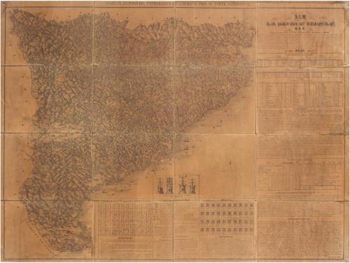 1850. MAPA. (CATALUNYA). MESTRES PUJOL, FRANCISCO:. VISTA DE LA POSICIÓN TOPOGRÁFICA DE CATALUÑA POR SU PARTE MERIDIONAL. Barcelona: V. Jordana Scrip., P. M. de la Barre fec. 82 x 103 cm, entelado de época, algo sucio. Papel ácido y algún cerco de humedad.