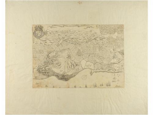 1660 ca. MAPA. (BARCELONA). PLANTA DE LA CIUTAT DE BARCELONA Y CIRCUNVALACIO DEL ENEMICH. Grabado calcográfico con el título en filacteria, escudo a izquierda y a derecha descricpión de leyenda en plancha. Ha perdido los márgenes y está sobrepuesto en papel verjurado con filigrana. No en cat. Soley.
