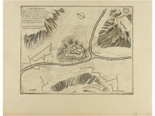 1700 ca. MAPA. (CAMPRODON). FER, N. DE:. CAMPREDON. VILLE FORTE DE CATALOGNE SITUÉE SUR LA RIVIERE DU TER... 1689. Paris: Chez S. de Fer, s.a. Firma la plancha Inselin. 18,5 x 23,5 cm huella, 24 x 31,5 cm papel. Extraído de "Les Forces de L'Europe, Asie, Afrique et Amerique ou description des principales villes avec leurs fortifications...comme aussi les Costes de France et de L'Espagne sur L'Ocean de la Mediterrannee...".