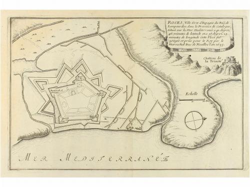 1720 ca. MAPA. (ROSES). [FER, NICOLAS DE:]. ROSES, VILLE FORTE D'ESPAGNE DU PAÏS DE LAMPOURDAN DANS LA PROVINCE DE CATALOGNE SITUÉE SUR LA MER MEDITERRANÉE... 1693. Plano 19 x 29,5 cm huella, 21,5 x 31 cm papel. Extraido de "Les Forces de L'Europe, Asie, Afrique et Amerique ou description des principales villes avec leurs fortifications...". Un fino taladro.