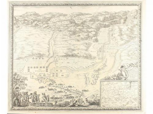 1745 ca. MAPA. (BALACHER). COCHIN, N.:. PLAN DE LA VILLE ET CHATEAU DE BALAGUIER EN CATALOGNE ASSIEGÉE PAR L'ARMÉE DU ROY... 1645. Paris: Par Beaulieu, s.a. 45 x 55 cm huella, 47 x 58 cm papel. Sobre papel verjurado con filigrana, bonita orla floral enmarcando el mapa y la escena militar de la parte inferior. Firmado en plancha. Alguna rasgadura.