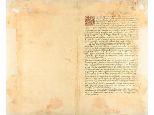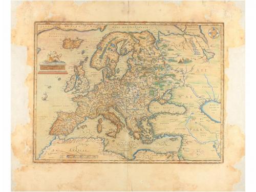 1580 ca. MAPA. (EUROPA). ORTELIUS, ABRAHAM:. EUROPAE. [Amberes, 1587]. Mapa calcográfico. Papel: 47 x 58 cm. Huella: 35 x 47 cm. Iluminado a mano. Reverso con texto en italiano y capital iluminadda. Laminado, pérdida parcial de los márgenes, sin afectar practicamente la huella. Pequeña resgadura en el margen inferior. Antigua señal de doblez central.