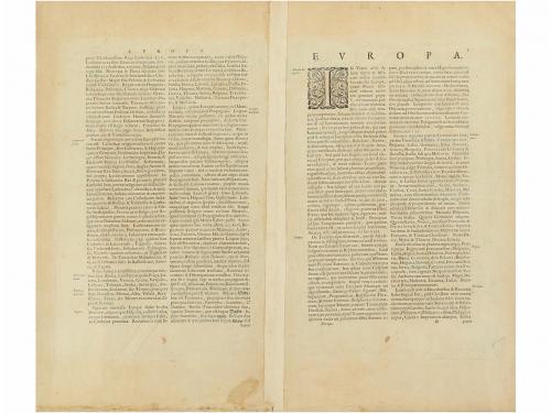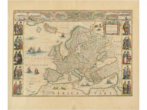 [1665 ca]. MAPA. (EUROPA). BLAEUW, GUILIERMO:. EUROPA RECENS DESCRPTA. [Amsterdam, 1665 ca]. Mapa calcográfico. Papel: 53 x 62,5 cm; huella: 41,5 x 56 cm. Iluminado a mano. Bellamente ilustr. con cartelas decorativas, los mares adornados con barcos y las masas de tierra con animales o figuras nativas. Enmarcado con viñetas: 9 vistas de ciudades en el margen superior y 10 viñetas de trajes típicos en los márgenes laterales. Reverso con texto a dos columnas en latín y apostillas marginales en latín e ilustr. con una capital xilografiada. Señal de doblez central restaurada. Mapa publicado en: "Atlas Maior Sive Cosmographia Blaviana, Qua Solvm, Salvm, Coelvm, Accvratissime Describvntvr". Koeman B1 56; van der Krogt 2:601-3.