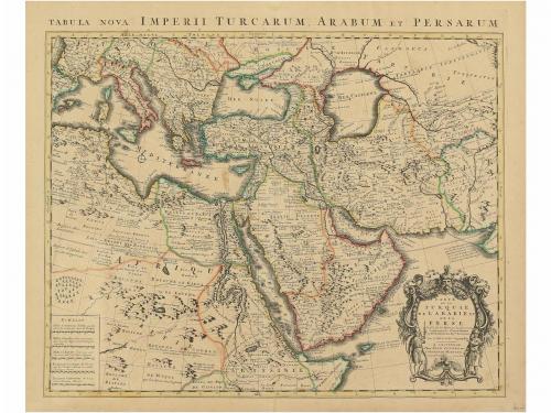 [1741 ca]. MAPA. (TURQUIA-ARABIA-PERSIA). ISLE, G. DE:. CARTE DE LA TURQUIE DE L'ARABIE ET DE LA PERSE. Amsterdam: Chez Iean Covens et Corneille Mortimer, [1741 ca]. Mapa calcográfico. Límites iluminados a mano. Antigua señal de doblez central con pequeña rasgadura en el margen inferior. Publicado en "Tabula Nova Imperii Turcarum, Arabum et Persarum".