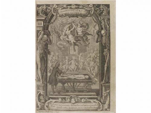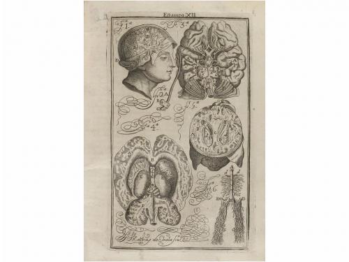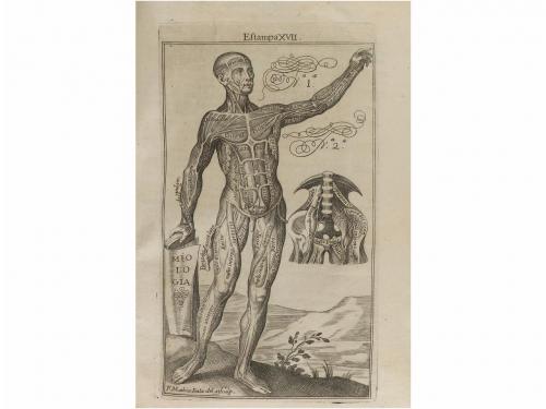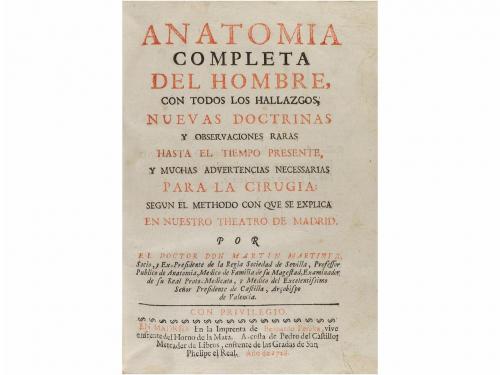1728. LIBRO. (MEDICINA-ANATOMÍA). MARTINEZ, MARTIN:. ANATOMIA COMPLETA DEL HOMBRE, CON TODOS LOS HALLAZGOS, NUEVAS DOCTRINAS Y OBSERVACIONES DADAS HASTA EL TIEMPO PRESENTE Y MUCHAS ADVERTENCIAS NECESSARIAS PARA LA CIRUGIA SEGUN EL METHODO CON QUE SE EXP. Madrid: Imp. Bernardo Peralta, 1728. 8º mayor. Frontis grabado por Mathias Irala + 16 h. + 601 p. + 4 h. Ilustr. con un retrato grabado dibujado por Valerius Iriarte y grabado por J. A. Palominoy 22 láminas numeradas más una proemial. Portada a dos tintas. Fina galería marginal en las primeras hojas. Algún leve cerco de humedad. Enc. en pergamino de época, con correas, lomera rotulada. Palau 154512.