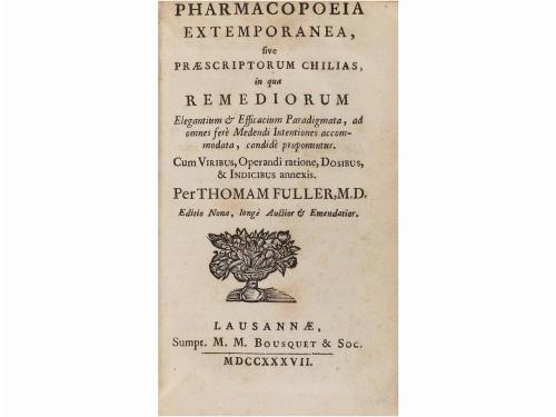 1737. LIBRO. (MEDICINA). FULLER, THOMAM:. PHARMACOPOEIA EXTEMPORANEA, SIVE PRAESCRIPTORUM CHILIAS, IN QUA REMEDIORUM ELEGANTIUM ET EFFICACIUM PARADIGMATA, AD OMNES FERE MEDENDI INTENTIONES... Lausannae: Sumpt. M. M. Bousquet & Soc., 1737. 8º menor. 16 h. + 382 p. + 17 h. Cabeceras y capitales xilografiadas, como la marca tipográfica de la portada. Algo corto de margen superior. Enc. en pergamino de época, lomera rotulada, cortes pintados.