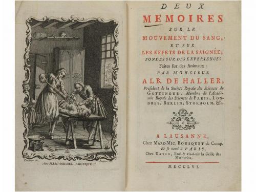 1756. LIBRO. (MEDICINA). HALLER, ALB. DE:. DEUX MEMOIRES SUR LE MOUVEMENT DE SANG ET SUR LES EFFETS DE LA SAIGNÉE, FONDES SUR DES EXPERIENCES FAITES SUR DES ANIMAUX. Lausanne: Chez Marc-Mic. Bousqet & Comp., 1756. 8º. Frontis grabado por Pasquier y Joubert + portada a dos tintas + VIII + 343 p. Enc. en plena piel, hilos dorados, en ambos planos, cejas, nervios, tejuelo, lomera cuajada, corte superior dorado firmada JORDI 1970.