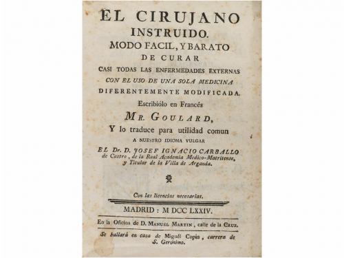 1761-1774. LIBRO. (MEDICINA). GOULARD; VAN-SWIETEN, BARON DE:. EL CIRUJANO INSTRUIDO. MODO FACIL, Y BARATO DE CURAR CASI TODAS LAS ENFERMEDADES EXTERNAS CON EL USO DE UNA SOLA MEDICINA DIFERENTEMENTE MODIFICADA. Trad. Josef Ignacio Carballo. Madrid: En la oficina de Manuel Martin, 1774. 8º mayor. 12 h. + 172 p. + 6 h. Enc. en pergamino de época. Señal de óxido. Su autor explica sus experiencias en cirugía y medicina a la vez que expone diferentes preparaciones de derivados del plomo para su uso en hospitales y declara haber encontrado en el extracto de Saturno la cura para numerosas enfermedades. Primera edición. Palau 106418. [Más:] DESCRIPCION COMPENDIOSA DE LAS ENFERMEDADES MAS COMUNES DEL EXERCITO, CON UN NUEVO, FACIL, Y SEGURO METHODO DE CURAR EL MAL VENEREO. Trad. Agustín Argüello y Castrillo. Madrid: Imp. Joaquin Ibarra, 1761. 12º. 16 h. + 237 p. Cerco de humedad en el margen superior de las primeras h. Enc. en pasta española, rozado, lomera reforzada con tela. Ligera señal de taladro en el margen inferior de las primeras h. Parece haber tenido un uso intenso. Primera edición. Palau 351801.