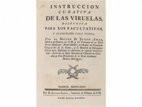 1774. LIBRO. (MEDICINA). AMAR, JOSEPH:. INSTRUCCION CURATIVA DE LAS VIRUELAS, DISPUESTA PARA LOS FACULTATIVOS. Madrid: Imp. Joachin Ibarra, 1774. 8º. XIX + 164 p. y un retrato grabado. [Más:] BALCELLS I CAMPS, JOSEF: MEMORIA FISICO-QUIMICA APLICADA A LA MEDICINA, SOBRE LA INFECCION EN GENERAL, Y EL CONTAGIO EN PARTICULAR... Barcelona: Imp. José Torner, 1832. 50 p. Dos obras enc. juntas en un vol. en media piel, cortes pintados, planos algo rozados.