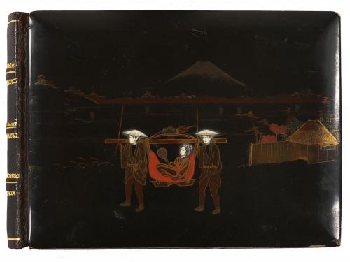 1890 ca. FOTOGRAFÍA. (JAPÓN). ÁLBUM CON FOTOGRAFÍAS DE PASAJES URBANOS Y DE INTERIOR EN JAPÓN. Álbum apaisado en 8º mayor. 50 fotografías de 9 x 14 , sobre papel albuminado y coloreadas. Con lomera de piel los planos trabajados en laca, cortes dorados. Entre las imágenes de geishas, guerreros, escenas costumbristas, hallamos también el retrato de la clientela y servicio de una casa de té en Kyoto.