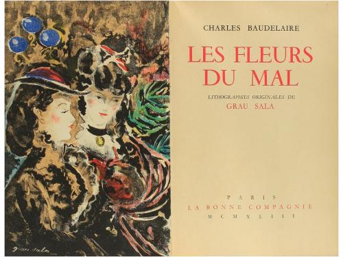 1943. LIBRO. (BIBLIOFILIA). BEAUDELAIRE, CHARLES; GRAU SALA (Ilustr.):. LES FLEURS DU MAL. París: La Bonne Compagnie, 1943. 8º mayor. 4 h. + 315 p. + 3 h. Ilustr. con 6 cromolitografías de GRAU SALA fuera de texto. Incluye una suite de las lám. aparte. Intonso. Rústica editorial ilustr con protección, con mínima rasgadura en la cubierta anterior, aun así buen ejemplar. Tiraje numerado de 2000 ejemplares sobre papel vélin.