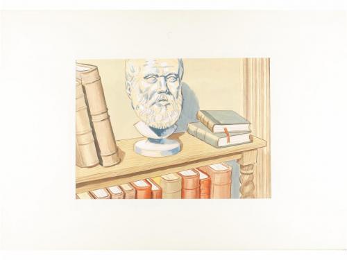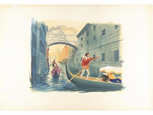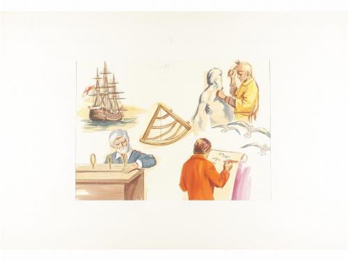 1980 ca. ORIGINAL ARTÍSTICO. (HISTORIA-INFANTIL). LOTE DE 128 DIBUJOS ORIGINALES PARA HOMBRES EN LA HISTORIA. Conjunto que contiene: 65 lám. de gran formato con originales sobre GALILEO y PLATON de 25 x 31 cm, presentados en paspartú de 35 x 50 cm. Más 63 Ilustr. en acuarela laminada en cartulina de 17 x 23 cm. aprox. Dibujos originales destinados a una publicación con fines divulgativos. OLIVER CRONWELL: 21 ilustraciones en papel sobre cartulina de 24 x 30 cm aprox. en técnica mixta. CÉSAR AUGUSTO, 30 dibujos en papel sobre cartulina de 24 x 30 cm aprox. en acuarela. ALEJANDRO MAGNO Y CESAR AUGUSTO, 63 ilustr. en gran formato de 21 x 29 cm, presentados en paspartú de 35 x 50 cm aprox. Dibujos para ilustrar una obra pedagógica. Sin firma. Contiene: LAS TRES HILANDERAS, 45 dibujos en acuarela sobre acetato de 25 x 35 cm. aprox. EL SASTRECILLO VALIENTE, 44 ilustraciones a la cera en papel 28 x 37 cm, sobre cartulina de 35 x 50 cm. Conjunto de dos grabados de gran formato por C. Lasinio. Huella: 47 x 82 cm. LE TAVOLE DELLA LEGGE y PASSAGGIO DEL MAR ROSSO. Abundantes señales de óxido y cercos de humedad. Dibujo de gran formato sobre los Cuentos de Canterbury de 41 x 90 cm y 56 x 104 cm. Técnica mixta con una hoja sobrepuesta de acetato, también iluminada. En la misma gran hoja se representan diferentes escenas. Presentado en paspartú.