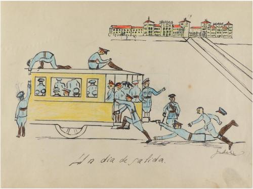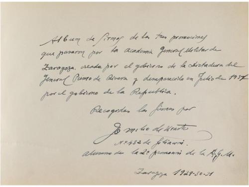 1929-1931. COLECCIONISMO. (ORIGINAL ARTÍSTICO-MILITAR). ÁLBUM DE FIRMAS DE LAS TRES PROMOCIONES QUE PASARON POR LA ACADEMIA GENERAL MILITAR DE ZARAGOZA... Creada por el gobierno de la dictadura del General Primo de Rivera y desaparecida en Julio de 1937 por el gobierno de la Republica. Recogidas las firmas por Emilio de Urarte. Zaragoza 1929-30-31. 8º apaisado. 66 h. Curioso cuaderno con las firmas de cadetes, ilustrado con dibujos e historietas de la academia. Enc. en media piel y tela, nervios.