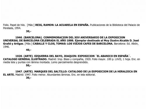 S. XIX-XX. LIBRO. (ARTE-MONOGRAFÍAS). LOTE DE MÁS DE 30 MONOGRAFÍAS Y CATÁLOGOS DE ARTE. CONFERENCIAS PUBLICAS RELATIVAS A LA EXPOSICION UNIVERSAL DE BARCELONA. Barcelona: Tipo-litografía de Busquets y Vidal, 1889. 8º.744 p. + 2 h. Enc. en media tela. [Más:] MARSA, ANGEL; MARSILLACH, LUIS: LA MONTAÑA ILUMINADA. Barcelona: Ediciones Horizonte, 1930. [Más:] BARCELONA. DIVULGACION HISTORICA. Barcelona: Aymá, 1948. Disponemos del listado completo de los lotes que componen este conjunto. Muy interesante.