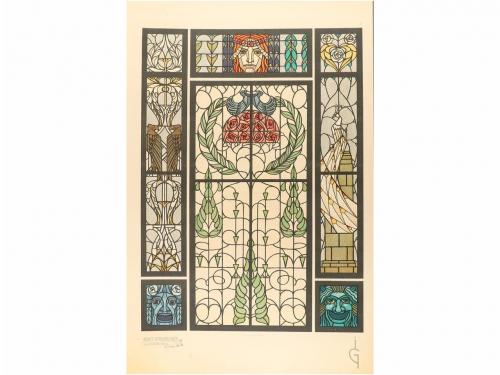 1900 ca. LIBRO. (ARTES DECORATIVAS-MODERNISMO). VV.AA:. BUNTE VERGLASUNGEN. Unter Mitwirkung von: R. Beauclair, G. M. Ellwood, P. Lang, R. Geyling, J. Goller, R. Bacard, A. Waldraff... Stuttgart: Julius Hoffmann verlag, 1900 ca. Gran folio. 1 p. + 24 cromolitografías. [Más:] VORBILDER FÜR KUNSTVERGLASUNGEN IM STYLE DER NEUZEIT... VON ARNOLD LYONGRÜN. Erste serie. Berlin/New York: Bruno Hessling. 2 h. + 16 cromolitografías. [Más:] VORBILDER FÜR KUNSTVERGLASUNGEN... Zweite serie. Id. 2 h. + 16 cromolitografías. Bella y rara obra de composiciones para vitrales de los más importantes artistas alemanes. Enc. en media tela.