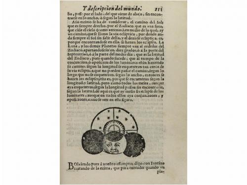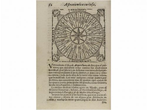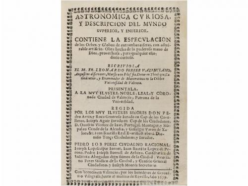 1677. LIBRO. (ASTRONOMÍA-COSMOGRAFÍA). FERRER, LEONARDO:. ASTRONOMICA CURIOSA Y DESCRIPCION DEL MUNDO SUPERIOR, Y INFERIOR. Contiene la especulación de los Orbes, y Globos de entrambas esferas... Valencia: herederos de Geronimo Vilagrasa, 1677. 8º mayor. 8 h. + 223 p. [Cristus]-2[Cristus]4, A-Z4, Aa-Ee4. Sin las dos últimas hojas de índices. Portada con orla xilográfica, corta de margen inferior. Ricamente ilustr. con capitales, cabeceras, culs-de-lampe y viñetas xilográficas. Texto con apostillas marginales. Rasgadura expertamente restaurada en la p. 93. Enc. en pergamino de época, lomera rotulada, conserva sus cierres. Exlibris de anterior poseedor. Palau 90321. CCPB 35571-2.