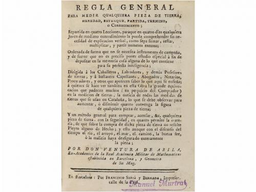 1780 ca. LIBRO. (AGRICULTURA). ABILIA, VENTURA DE:. REGLA GENERAL PARA MEDIR CUALQUIERA PIEZA DE TIERRA, HEREDAD, ESTANQUE, PARTIDA, TERMINO, O CORREGIMIENTO; REPARTIDA EN QUATRO LECCIONES... Barcelona: Imp. Francisco Suriá y Burgada, s.a. 8º menor. 70 p. + 1 lám. plegada. [Sigue:] SUPLEMENTO A LA REGLA GENERAL... Id. 2 h. + 67 p. + 1 lám. plegada. Enc. en un vol. en pergamino de época, con la lomera rotulada. Sellos húmedos de anterior poseedor.