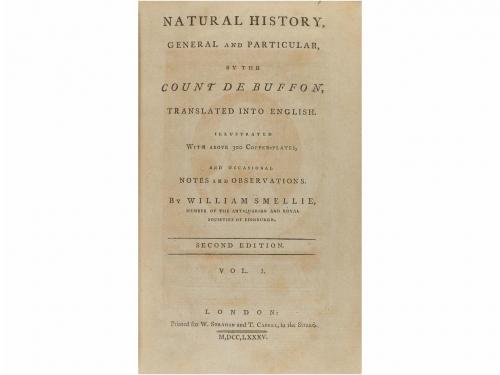 1785. LIBRO. (HISTORIA NATURAL). BUFFON:. NATURAL HISTORY, GENERAL AND PARTICLAR... by William Smellie... Secon edition. London: Printed for W. Strahan and T. Cadell, 1785. 9 vol. en 8º mayor. I: Frontis + XX + 514 p. + 2 mapas plegados. II: 2 h. + 517 p. + 8 lám. III: IV + 2 h. + 524 p. + 15 lám. IV: VII + 352 p. + 77 lám., una de ellas plegadas. V: VIII + 440 p. + 64 lám. VI: 2 h. + 443 p. + 35 lám. VII: VII + 452 p. + 57 lám. VIII: VII + 352 p. + 44 lám. IX: VIII + 422 p. + 1 h. + 6 lám. plegadas. Profus. ilustr. con 307 lám. calcográficas fuera de texto grabadas por A. Bell. Pequeña restauración al final del vol. III. 9 vol. enc. moderna en media piel y papel al agua, dorados en ambos planos y lomera, nervios, doble tejuelo; cortes dorados. Buen ejemplar, COMPLETO.