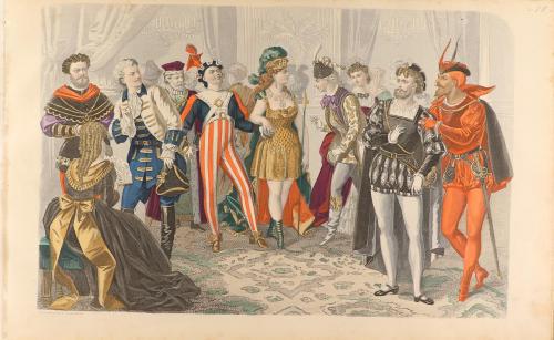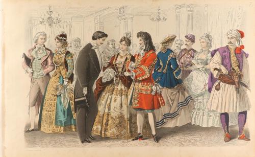 1880 ca. GRABADO. (GRABADOS-MODA). ALBUM DU PROGRÈS. COSTUMES HISTORIQUES, ARTISTIQUES ET TRAVESTIS. Paris: Agusute Picart, s.a. Folio mayor apaisado. 1 h. + 25 grabados calcográficos coloreados a mano. Muy ligera señal de óxido. Enc. en media piel, rozada.