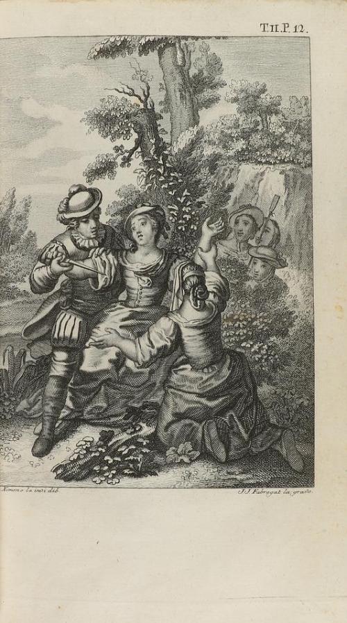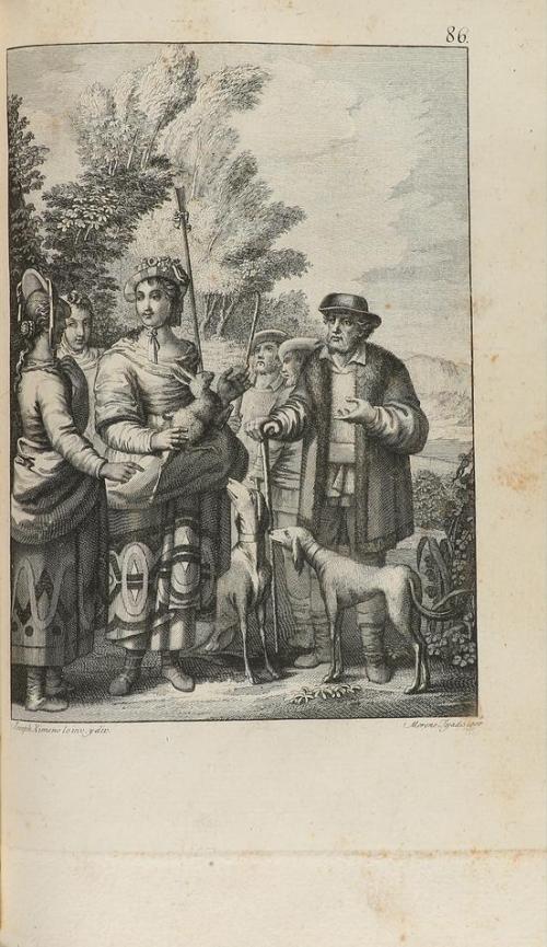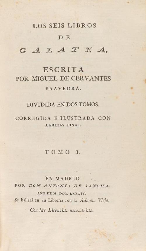 1784. LIBRO. (CERVANTINA). CERVANTES SAAVEDRA, MIGUEL DE:. LOS SEIS LIBROS DE GALATEA. Madrid: Antonio de Sancha, 1784, se hallará en su libreria, en la Aduana Vieja. 2 vol. en 8º. I: XVI + 304 p.+ 6 láms. Lleva al final añadidas las p. 353 a 364 que corresponden al tomo II, si bien aquel está completo. II: 2 h. + 364 p.+ 6 láms. Enc. en pasta española, doble tejuelo, lomera cuajada, cortes pintados. Palau 51937 "Bella edición con 6 láms. en cada tomo, dibujadas por J. Ximenoy grabadas por J. Pro, Moreno Tejada, S. Brieva. B. Vazquez y J. Fabregat".