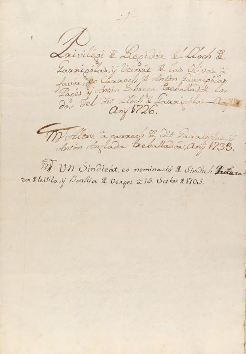 1726-1810 ca. MANUSCRITO. CONJUNTO DE DOCUMENTOS MANUSCRITOS DE LA FAMILIA GARRIGOLAS. EL lote contiene en documentos manuscritos lo siguiente: Privilegio de regidor del lugar de Garrigolas y las Olives a favor de Antón Garrigolas Pagés y Antón Fábrega (1726); Título de procurador síndico de la ciudad de Gerona y su término a favor de D. Antonio Garrigolas (1806); Documentos sobre la obtención del título de caballero de Antonio Garrigolas y correspondencia (1797); correspondencia para la obtención del título de ciudadano honrado de Barcelona y certificación de armas de la familia (1802); censo de Teresa Fabregas y otros (1808); Documentos sobre el ingreso de Ramón y Narcis Garrigolas como cadetes en el regimiento de infantería Ultonia (1806-1809).