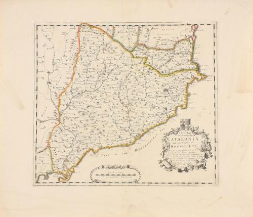 1684. MAPA. (CATALUNYA). MORDEN, ROB.:. NEW MAPP OF THE PRINCIPALITY OF CATALONIA AND THE COUNTY OF ROUSSILLON WITH A DESCRIPTION OF the COUNTRY CHEIF TOWNES RIVERS HIGHWAIES... London: 1684 ca. 40 x 45 cm huella, 54 x 63 cm papel. Con los límites coloreados.