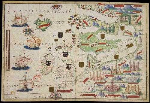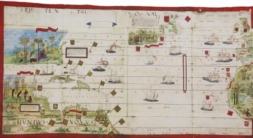 2003. LIBRO. (FACSÍMIL). ATLAS MILLER. Barcelona: Ed. Moleiro, 2003. Facsímil del original custiodado en la Bibliothèque nationale de FRance. Compuesto de 6 pergaminos que contienen 8 mapas impresos en imitación de pergamino de 41,5 x 59 cm y 2 mapas de 61 x 117 cm. Iluminados con abundantes dorados. Presentado en un estuche de seda a la medida del mapa grande que se presenta enrollado y otro estuche para las láminas. Edición limitada a 987 ejemplares, con acta notarial. Se acompàña del libro de comentarios en su caja editorial.