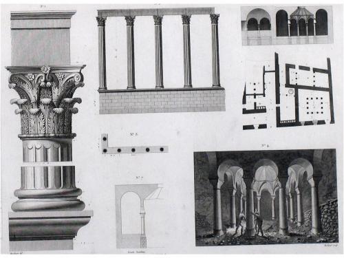1810 ca. GRABADO. (BARCELONA). 5 GRABADOS DE LA OBRA DE LABORDE VOYAGE PITTORESQUE EN ESPAGNE. Interior de la Catedral de Barcelona- Plano, corte y elevación de la Lonja de Barcelona; Vista del Paseo Nuevo de Barcelona-Vista de la plaza nueva y de una de las puertas antiguas de Barcelona; Detalles del templo de Hércules y Vista interior de los Baños. 5 grabados en 3 hojas de 40 x 55 cm. Grabados por Ballard, Godefroy, Reville, Denoist y Delaporte según dibujos de Moulinier, Ligier, Dutailly.