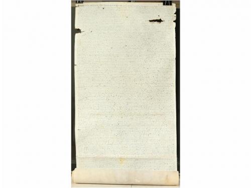 1580-1604. MANUSCRITO. (VALENCIA-VENTA). PERGAMINO MANUSCRITO DADO POR EL JUEZ HIERONIMUS SANCHO. Pergamino manuscrito en latín y catalán en letra cadenilla/humanística. Pergamino montado en tres hojas cosidas de 2,40 x 57 cm. Traspaso de documentos que tratan sobre la titularidad de unas propiedades en Valencia de la familia Molins. Con signum notarial. Pequeña falta en la parte superior.